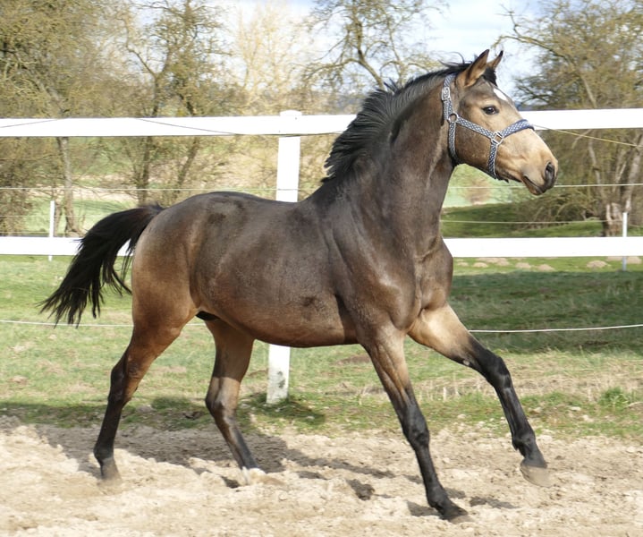 He is simply a dream! Morgenstern, a 3-year-old buckskin gelding by Michelangelo out of Ismo x Polany x Direx. Stunningly handsome, with impressive movement, and his pedigree makes him highly promising for eventing and show jumping!