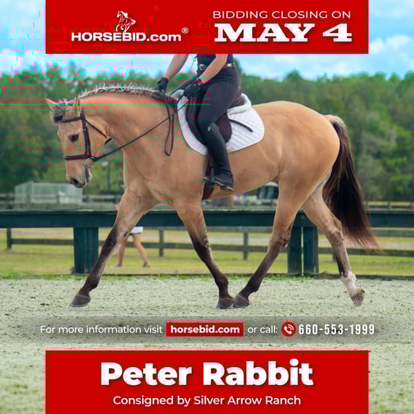 ▪️▫️◾️𝐭𝐡𝐞 𝑴𝒂𝒚 𝐒𝐞𝐥𝐞𝐜𝐭◾️▫️▪️ Happening now thru MONDAY | MAY 4th - Available EXCLUSIVELY on HorseBid's website! For more details and to register visit: www.Horsebid.com CONSIGNOR CONTACT: Silver Arrow Ranch 660-553-1999 LOCATION: Ocala, FL BREED: Warmblood X REGISTERED: No REGISTERED NAME: Peter Rabbit COLOR: Dunskin HEIGHT: 15.3 AGE: 5 GENDER: Gelding 🐰 Peter Rabbit – Hop Into Your Next Adventure 🐰 This handsome 5-year-old dunskin gelding is the definition of a versatile, go-anywhere partner. With a unique look and an even better mind, Peter is the kind of horse that makes every ride feel like an adventure. He’s done it all—countless trail rides, cross country, schooling shows, obstacle courses, beach rides, and more. Whether he’s at home or off property, Peter stays the same steady, confident, and non-spooky horse you can rely on. Peter is a sensitive, responsive ride, making him a great choice for someone who wants to really connect with their horse and explore multiple disciplines. He’s athletic, willing, and ready to go in whatever direction you choose—whether that’s the trails, the show ring, or something in between. He’s the kind of horse that makes you feel in tune—light, fun, and rewarding to ride—while still being dependable and level-headed in new situations. If you’re looking for a versatile partner with personality, talent, and a great brain, Peter Rabbit is ready to hop right into your life.
