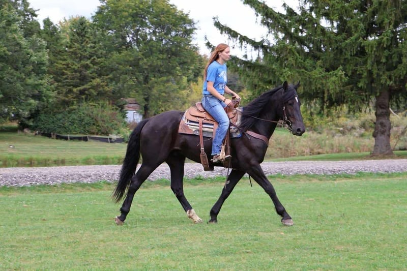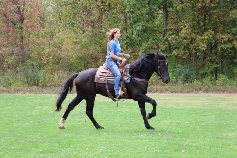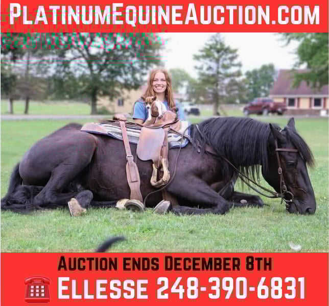 ONLINE AUCTION Place your bids at www.PlatinumEquineAuction.com Starting Bid $3500 Auction ends December 8th, 2024 Need a new saddle? Check out White Rock Saddles on our website or Facebook! We are proud to offer Tony for sale. Here’s a horse with a heart the size of Texas and a mind as bright as the stars. Tony is a 5 year old jet black canadian warmblood gelding who stands 16.2hh. Tony is built very correct with stout confirmation solid bone structure and nice hooves. If you could snap your fingers and turn your favorite puppy dog into a horse, Tony would appear. He has THE sweetest personality of any horse you will find! Tony will come running to you when you call his name at the pasture gait. This boy has taken to his liberty and trick training like a horse twice his age. He knows how to lead halter-less, lay down, say yes and no, and how to sit on a bean bag or a pile of shavings but he personally prefers to relax in a recliner. He knows his tricks well and it is effortless on his humans part. This is the type of horse if you give him a job he’s going to get it done! And you only have to show him once he’s as sharp as a tack. In addition to his puppy like qualities he is one stellar riding horse. He has a soft mouth and moves off seat and leg pressure. Tony will side pass, pivot, and back up. He would do amazing in any trail or Obstacle class. He will lead the way, follow behind or even ride away from his buddies. His transitions both upward and down are going to be a force to be reckoned with as he will canter right out of his tracks and stop on a dime. With little effort from his rider. Tony also loves to hit the trails. He has been camping and ridden all over Michigan. Woods roads brush water wildlife all no issue for him. He will ride out in a group or alone. He has also been exposed to Michigans hunt country and we think he would be a stellar hunt horse. He’s participated in a few paces and loves it! Tiny also has some basic dressage training and is schooling some 1st level moves. We have also started him over fences and this boy jumps in great form. He marches around hunter courses inside and out with ease. Again give him a job and he will be happy to do it. He holds a steady pace to the fences and you do not have to be accurate to jump him around he will take a joke! This boy has potential to be a top contender in the show ring in a variety of disciplines. He has also been driven and is 100% road and traffic safe! Tony is going to check off a lot of boxes on a lot of peoples wish lists and this is the type you do not want to pass up on. Tony lives in Howell MI 48855 Feel Free to call or text Ellesse Schwartz 248-390-6831 with questions or to facetime with Tony. ONLINE AUCTION Place your bids at www.PlatinumEquineAuction.com Starting Bid $3500 Auction ends December 8th, 2024 Need a new saddle? Check out White Rock Saddles on our website or Facebook!