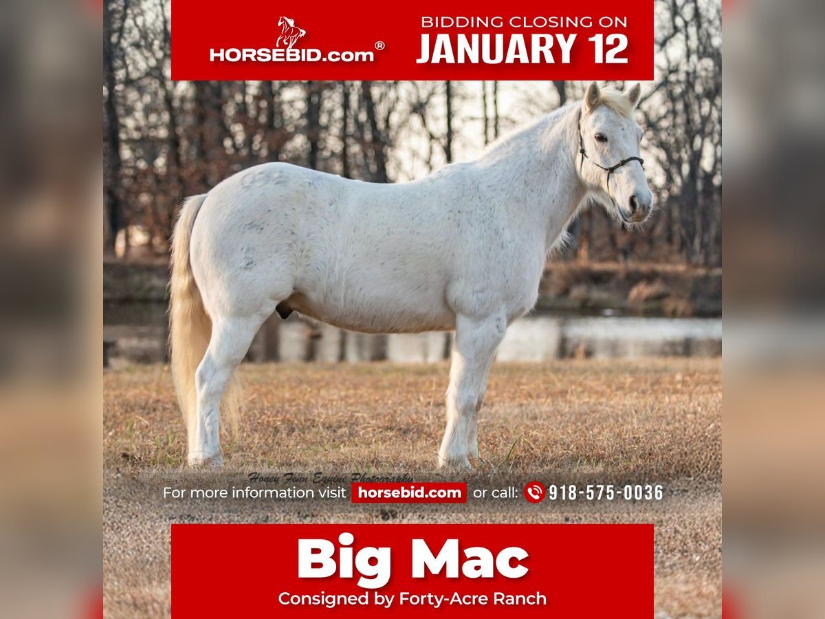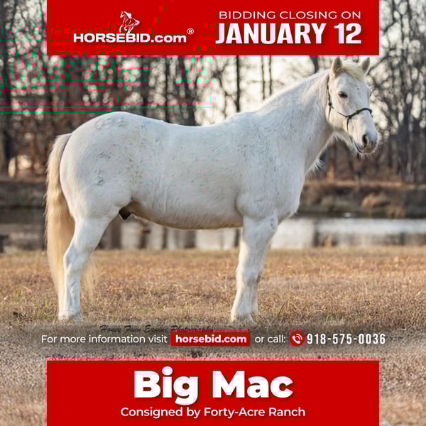 ♦️𝐍𝐄𝐖 𝐘𝐄𝐀𝐑'𝐒 𝑬𝒙𝒕𝒓𝒂𝒗𝒂𝒈𝒂𝒏𝒛𝒂♦️ Happening now thru MONDAY | JANUARY 12th - Available EXCLUSIVELY on HorseBid's website! For more details and to register visit: www.Horsebid.com CONSIGNOR CONTACT: Forty-Acre Ranch 9185750036 LOCATION: Muldrow, Oklahoma BREED: Welsh Pony REGISTERED: No COLOR: Grey HEIGHT: 11.3 AGE: 7 GENDER: Gelding Meet Big Mac — the little pony you didn’t know you needed, but won’t want to give back. Standing 11.3 hands tall, he may be pint-sized, but he’s a 7-year-old gelding that thinks he’s a full-time ranch horse. Big Mac is a real working pony — handy broke, checks fence, pushes a cow when asked, and rides the road like he pays taxes on it. He’s smart, sure-footed, and honest as the day is long. You can jump on him, backflip off him, slide off him — he just stands there wondering what’s next. He loads great, stands like a statue for baths and the farrier, and is kid broke enough to walk around without complaint. He’s not a cuddle bug, but he’s easygoing and doesn’t throw a fit. He’s the kind that makes you grin every time you throw a leg over and reminds you good ones don’t have to be tall. If you’re looking for a small pony with a giant heart and real job experience, Big Mac is waiting in Muldrow, Oklahoma.