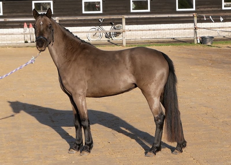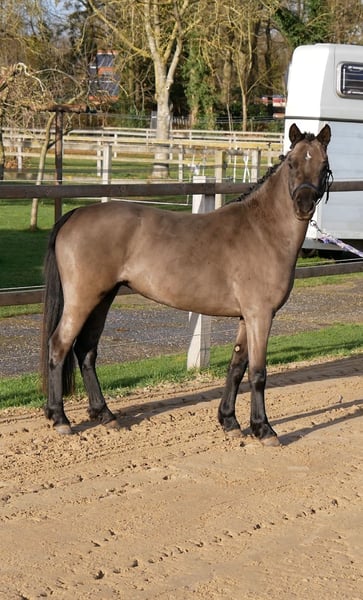 Doutzen, que nous appelons Doortje dans notre écurie, est une jument noire magnifique. Très douce en manipulation. Elle accepte de donner ses pieds, de rester en place, de marcher calmement en longe, ainsi que de se faire brosser et raser sans problème. C’est un poney qui adore travailler. Elle aime faire des exhibitions et reste toujours motivée. Elle connaît déjà le travail en longe avec une seule ligne et en longues lignes doubles. Elle a également porté un filet simple et un bridon, ce qui ne lui a posé aucun souci. Chaque semaine, elle part en promenade en main, que ce soit le long du chemin ou en forêt. Elle est toujours très calme et volontaire lors de ces sorties. Elle ne se laisse pas facilement impressionner par la circulation ou d’autres éléments que l’on peut rencontrer lors d’une promenade à l’extérieur. Je pense que Doortje s’épanouirait idéalement comme poney de loisir ou poney de dressage. Elle adore travailler et possède trois allures de qualité. Nous continuerons à l’éduquer tranquillement dans les semaines à venir, et son prix augmentera à mesure de l’avancement de sa formation. Le seul petit inconvénient de Doortje est qu’elle peut avoir des démangeaisons en raison d’un régime riche en sucre. Elle ne reçoit que du foin, un peu de granulés sans céréales ni luzerne. De cette façon, elle ne souffre pas de démangeaisons.
