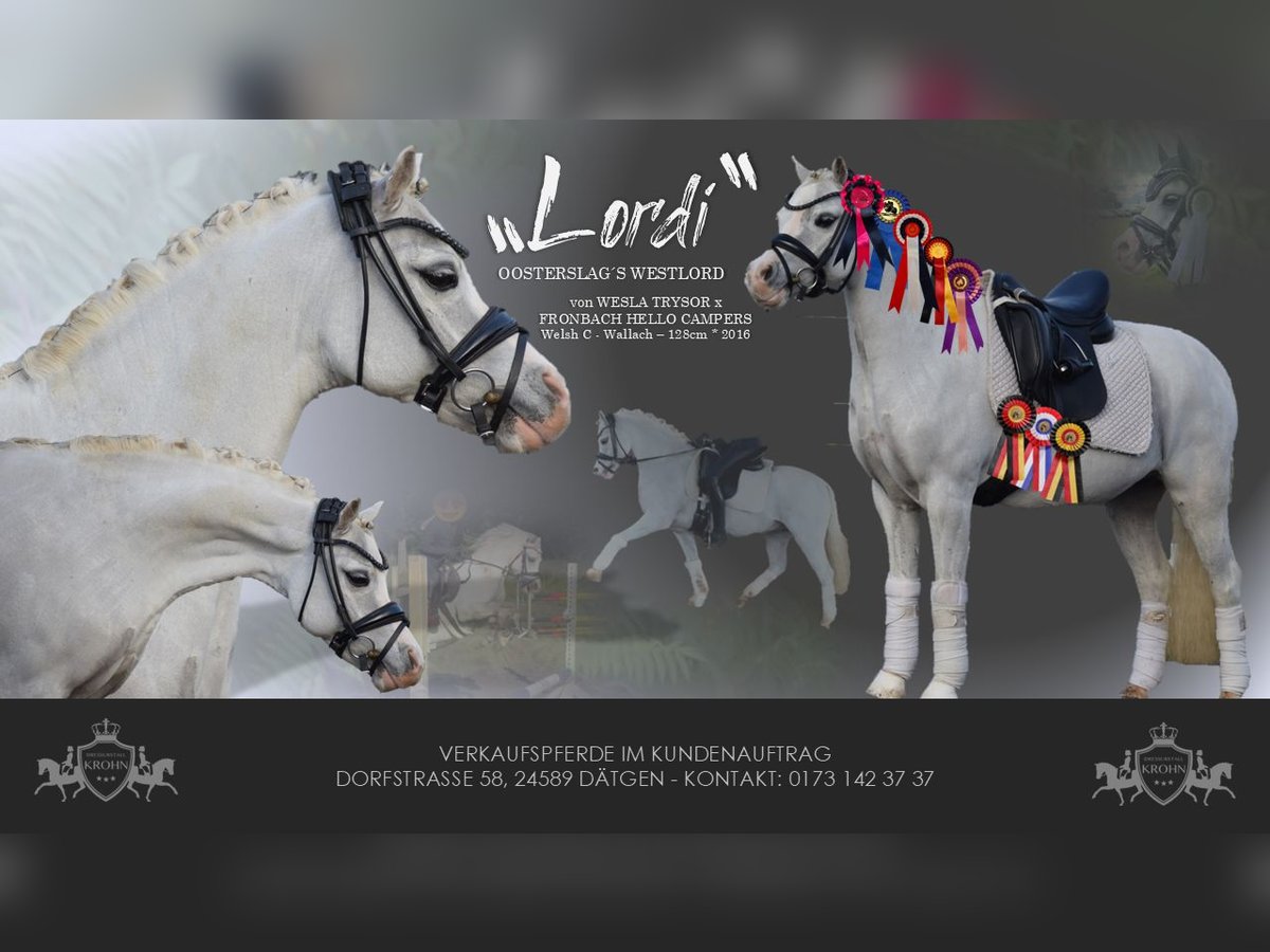 WUNDERSCHÖNER & BEWEGUNGSSRARKER SCHLEIFENSAMMLER & ALLESKÖNNER FÜR DIE KLEINEN - TURNIERE - DRESSUR - SPRINGEN - GELÄNDE - WASSER - AUSRITTE - DIESES PONY EBNET EINEM ALLE WEGE - Kinder, Junioren, Anfänger geeignet! Zum Verkauf steht in Vertretung des Besitzers, dieser beeindruckend schöne, 128 cm große, 9-jährige, hollandische Welsh Schimmel Wallach von WESLA REYSOR x FRONBACH HELLO CAMPERS. Mit "LORDI" ist der Niedlichkeitsfaktor total erreicht, an seiner Box kommt keiner Vorbeo ohne den kleinen "LORDI" anzuhimmeln. Er nutzt das Charmant aus und lässt sich genüßlich mit Streicheleinheiten jederzeit gerne Verwöhnen. "LORDI" wurde bereits mehrfach von Kindern erfolgreich im Turniersport, sowohl in der Dressur , als auch im Springen vorgestellt. Er ist Parcoursicher, kennt bunte Sprunge und auch unterbauten und zieht immer mittig auf den Sprung zu. Ein stehenbleiben oder Umlenken kennt "LORDI" nicht, er zieht voller Motivation über den Sprung uns vermittelt dadurch absolute Sicherheit. In der Dressur ist er auf sicherem A Niveau ausgebildet und lässt sich vorbildlich reiten. Er läuft sicher und leicht in Anlehnung auch ganz ohne Hilfszügel. Bodenarbeit ist "LORDI" ebenfalls bekannt und er ist ein souveräner Partner in jeder Lebenslage. "LORDI" ist immer fröhlich wenn man sich mit Ihm beschäftigt und für jeden Spaß zu haben, ob Kostümwettbewerb, oder mit Fingermalfarbe bemalt zu werden, er genießt alles und freut sich über jede Abwechslung, er ist daher ideal für Kinder. Ein umfangreicher guter röntgologischer und klinischer Tüv liegen vor und seiner Zukunft als Sport- und Famielenpartner steht nichts im Wege. "LORDI" lässt gewiss alle herzen höher schlagen und bereichert jede Familie.