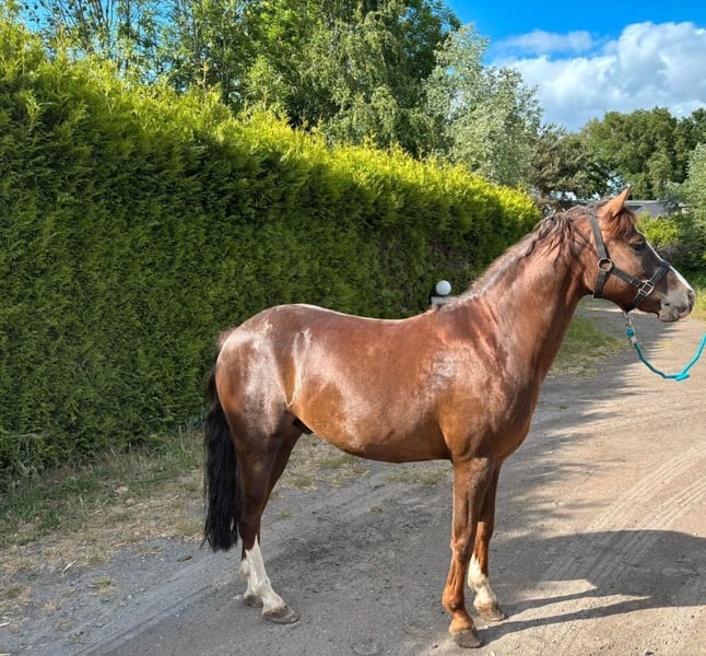 Hiermit biete ich meine wunderschöne Pony zum Verkauf an. Er ist sehr lieb im Umgang und steht immer für dich bereit. Er kennt einige Sprünge und wird fein im Dressur geritten. Außerdem hat er auch noch schöne Abzeichen. Bei Fragen schicke gerne eine Nachricht oder ruf an.