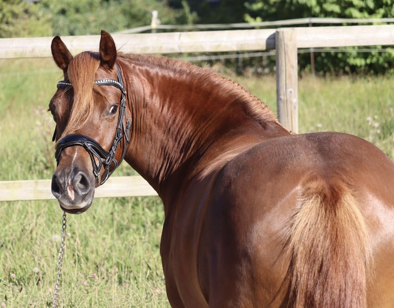 For sale on behalf of the owner: "Scarlett" is a lovable 4-year-old Welsh Cob mare. Standing at 1.45m, this dark chestnut mare captivates with her beautiful face and excellent basic gaits. An additional eye-catcher is undoubtedly her white hairs and light mane and tail. Of course, she is blacksmith and loading friendly. Scarlett is sired by Crumpwell Benito x Möhlenbeeks Siegerin. From this pedigree, many talented show jumping ponies have already emerged, which we can also envision for Scarlett. She was already awarded a premium at the foal registration. Last year, Scarlett was gently backed and prepared for life as a riding pony. After a development break in the pasture, her training is now resuming, and she continues to show a willingness to learn, motivation, and openness to new experiences. She stays in a box at night and goes out to pasture during the day in a mare herd, where she always demonstrates social and friendly behavior towards her peers. Scarlett will be a reliable partner for the whole family and will only be sold to loving hands. If you are interested and would like more information or videos, please feel free to contact us. The sale price will increase with further training.