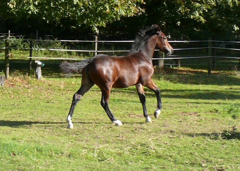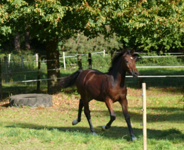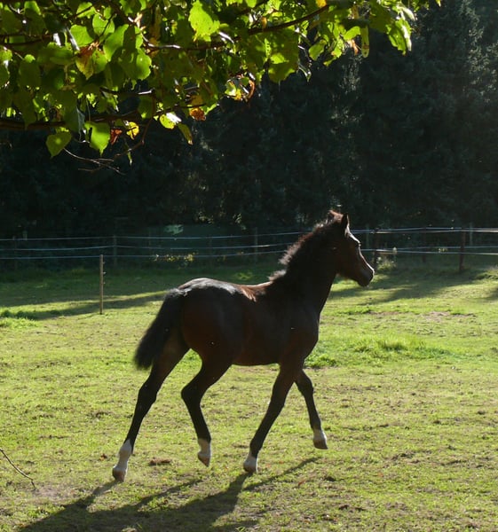 Qualitätvolles Stutfohlen von Elite LH Hengst Dieses Stutfohlen ist mit ihrem Charme, Ausdruck und Qualität ein Blickfang. Aufgrund der Abstammung sowohl für Sport und Freizeit, als auch für die Zucht geeignet. Vater ist der „Elite LH Halifax“, Welsh-B, braun, Stockmaß 142cm. Halifay ist FN-Bundessiegerhengst Springen; Vater von mehr als 30 gekörten Hengsten, davon 9 Körungs- oder Reservesieger, mindestens 26 Staatsprämienstuten, 3 Bundeschampions und 2 Vize-Bundeschampions. Die Mutter „V. Magic Lady“, Welsh-Cob, D-braun, Stockmaß 148cm, wurde in jungen Jahren sehr erfolgreich auf Zuchtschauen in Deutschland Holland und Belgien vorgestellt: u.a. Gesamt-Siegerfohlen, Klassensieger und Champion Welsh-Cob, entstammt einer sehr erfolgreichen Familie. Ihr Großvater „Trevallion Picasso“ war mehrere Jahre hintereinander erfolgreichster Vererber bei den gerittenen Welsh-Cob in Großbritannien. Des weiteren finden wir auf der Mutterseite 2mal „Derwen Dessert Express“. Dieser Stempel-Hengst war und ist ganz besonders erfolgreich in der Welsh-Cob-Zucht, aber auch unter dem Sattel sind seine Nachkommen hoch erfolgreich und gefragt. Das Stutfohlen, geboren am 07. Mai 2025, braun, kleiner Stern und 4mal weiss an den Beinen. Erwachsen erwarte ich ein Stockmaß von ca. 148cm, ähnlich der Mutter. Gerne beantworte ich ihre Fragen; bitte Mobil 0178 45 07 123 anrufen und evtl. auf Band sprechen; Danke !