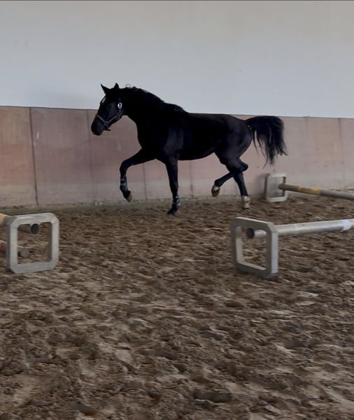 Se vende un prometedor semental de alta calidad con abrigo negro, nacido en abril de 2022. Fue montado a mediados/finales de mayo y ya ha realizado algunos saltos bajo la silla. TUV disponible: Impecable. Altura actual aproximada: 1.70 m. Línea de sangre: Cornet de Semilly x Classe VDL x Lupicor x Cor de la Bryere. Este semental, excepcionalmente elegante y con un fuerte carácter, aporta una gran calidad de movimiento y capacidad, con un notable estilo de salto. Es una garantía y un portador de esperanza para la gran gira. A mediados/finales de marzo: Campeonato de salto libre. Los jueces elogiaron especialmente sus movimientos por encima de la media, su calma y serenidad, así como su capacidad en el salto. Esto se recompensó directamente con una calificación de 8,8.