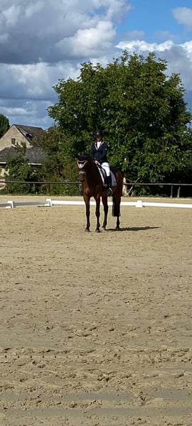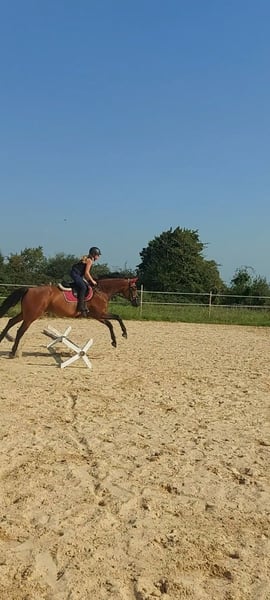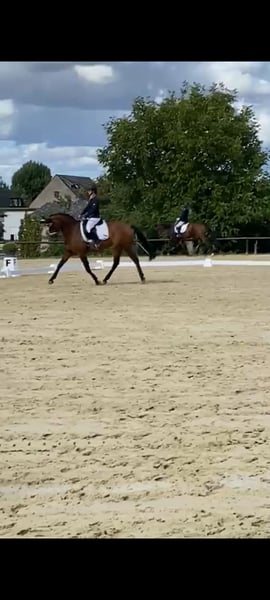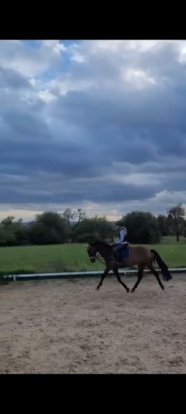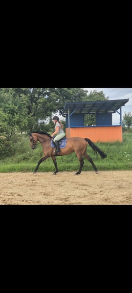 Zum Verkauf steht eine ca 165 cm grosse brave 10 jährige Stute von continus Stern. Die Stute ist brav geritten ist leichtrittig und benimmt sich auch auf dem Turnier gut. Aktuell wurde sie spontan in einer A dressur gestartet läuft auch brav mit 11 jähriger durch dressurreiterwb. Dieses Wochenende siegte sie auf einem wbo turnier mit 11 jähriger mit einer 8.5 im Dressurreiterwb und mit einer 8.2 in einer ü30 e dressur. Sie ist in der Dressur sofort im a Bereich einsetzbar. Sie springt mit jedem Kind fliegende Wechsel, lässt sich mit ausbindern reiten, geht problemlos auf den Hänger und ist auch brav beim Schmied. Sie ist bis S springen gegangen ist aber dort sauer geritten und wird deshalb nicht als springpferd verkauft. Wer sich die Mühe machen möchte und ihr Zeit lässt bekommt sicher ein tolles Pferd. Stangenarbeit und Kreuze und Sprünge aus dem trab macht sie hingegen sehr gerne. Springt auch Geländesprünge. Aktuell steht sie in einer gemischten Herde auf der Wiese kennt es aber natürlich auch in der Box zu stehen. Sie hat ein wenig Schwung an den man sich gewöhnen muss. Sie ist sicher ein nettes Familienpferd und ein richtiger Allrounder. Sicher auch interessant für die zucht. Gerne darf sie in Wiesbaden kennengelernt werden.
