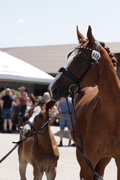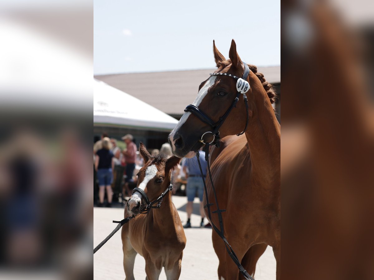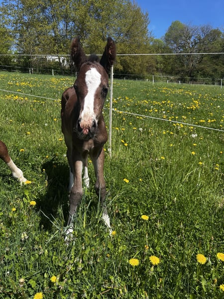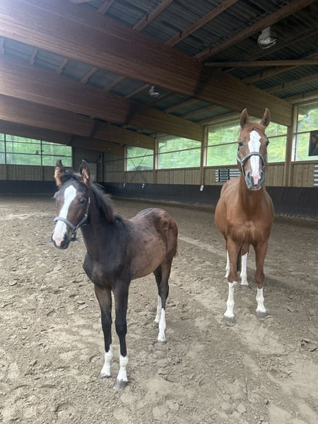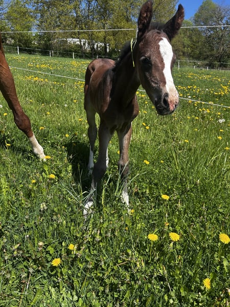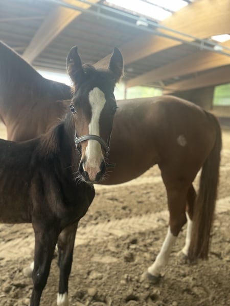 We are offering our Dancing Ballerina, born on April 27, 2025, to the best and most supportive hands. She is dark brown with a blaze and four high whites, and she delights us every day since her birth. She is very open-minded and curious. She is sired by the state stallion Diamantenglanz, who is in training with Helen Langehanenberg. Her mother is highly placed up to M** in dressage and also has a great jump. Overall, she is a very uncomplicated mare. Dancing Ballerina can move to her new home at the end of October or can happily stay with us for raising and later training.