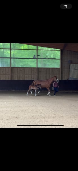 En las mejores y más cuidadosas manos entregamos a nuestra Dancing Ballerina, nacida el 27 de abril de 2025. Es de color castaño oscuro con una mancha blanca en la cara y cuatro patas blancas por encima del corvejón, y nos encanta desde que nació, día tras día. Es muy sociable y curiosa. Es hija del semental Landbeschäler Diamantenglanz, que está en entrenamiento con Helen Langehanenberg. Su madre, hasta M** en la disciplina de doma, también muestra un excelente talento para saltar. En general, es una yegua muy fácil y equilibrada. Dancing Ballerina puede mudarse a finales de octubre o, si se prefiere, puede quedarse con nosotros en la cría y en la futura formación.