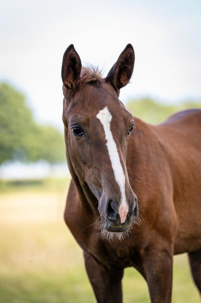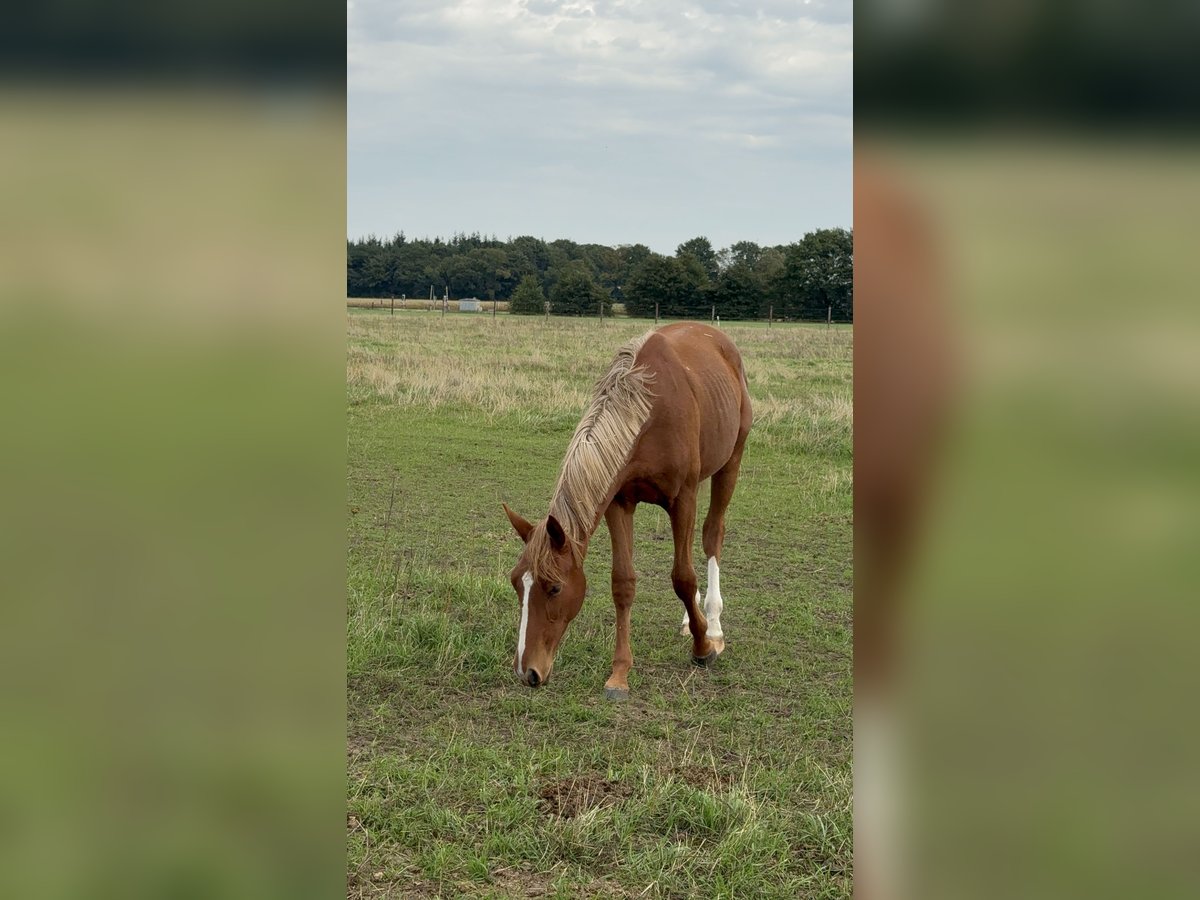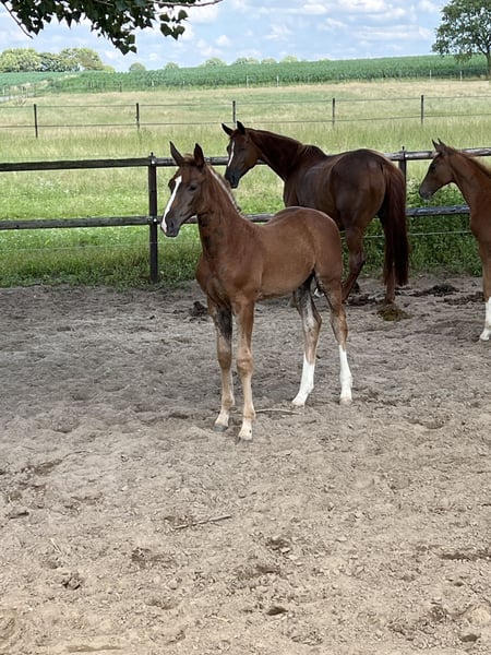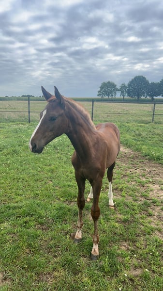 For sale is a two-year-old dressage-bred mare registered with the Westphalian Studbook, complete with a valid passport. Currently, she is being raised in an age-appropriate environment within a herd of mares. She demonstrates social skills, balance, and ease of handling—neither dominant nor submissive, but well-integrated and friendly. In daily interactions, she is very well-behaved and people-oriented: - Easy to halter, - Polite in giving her hooves, - Touchable everywhere (ears, tail, etc.), - Calm, affectionate, and relaxed, - Very pleasant to handle, even in new situations. She is a dark chestnut with a currently light mane, likely to retain this special and rather rare coloration. Raised appropriately for her age, she has excellent potential for further training in dressage. She is ideally suited as a future amateur or young horse and will, one day, be a true dream horse for riders who value a straightforward, loving temperament. Sale is due to personal reasons and will only be made to the best of hands.