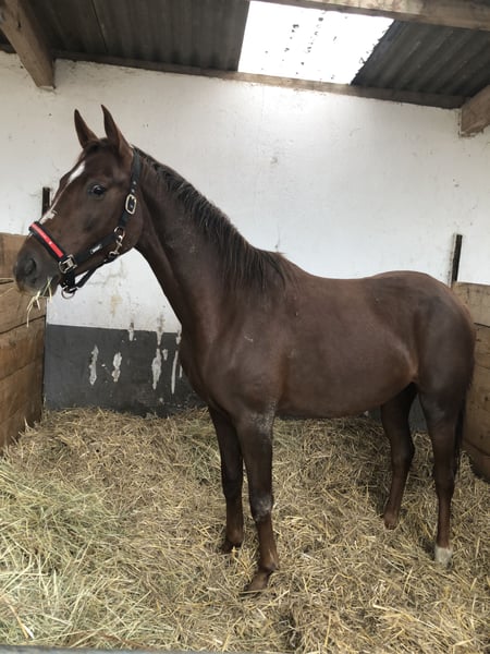 Top three-year-old dark chestnut mare with excellent movement. Friendly and gentle in handling, and performance-ready. She comes from top bloodlines, and her athletic potential is in the higher range.