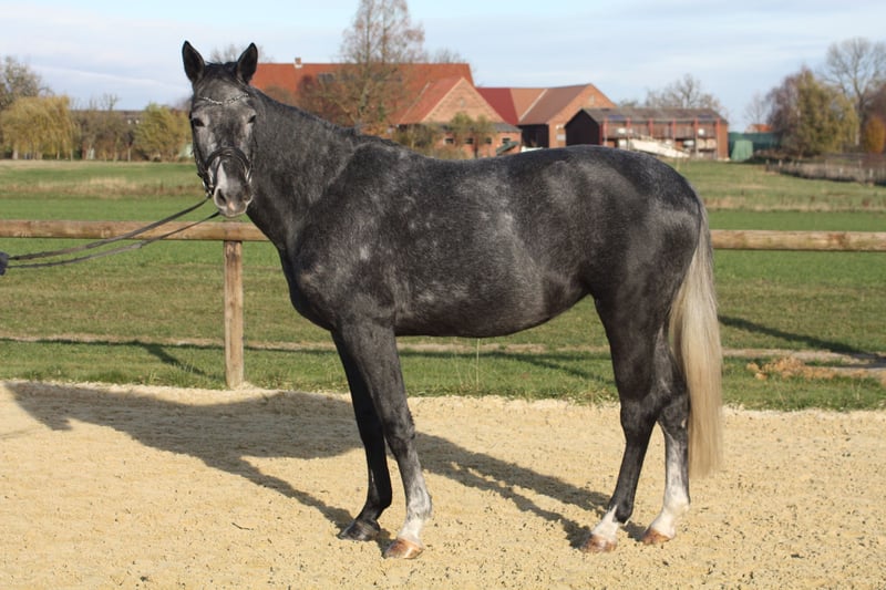 Verkaufe Westfalen-Stute von Doppelbundeschampion Diaron – Rappschimmel, geb. 2021 6 Zum Verkauf steht eine hübsche Westfalen-Stute, geboren im Jahr 2021, mit einem momentanen Stockmaß von 166 cm. Da sie auch sehr kurz ist, wirkt sie etwas kleiner als sie wirklich ist! Sie ist brav im Umgang, lernwillig, schmiedefromm. Ideal für ambitionierte Reiter, die sich eine Partnerin im Springsport aufbauen wollen. Die Mutter war serienplatziert in Springpferdeprüfungen und wurde nur aus Reitermangel nicht weiter gefördert. Der Vater Diaron bedarf keiner weiteren Erklärung als Doppelbundeschampion. Die Stute wird lediglich aus Zeitmangel verkauft und soll in fördernde Hände kommen. Sie ist an Trense und Sattel gewöhnt, geht regelmäßig in der Führmaschine und an der Longe. Weidegang erhält sie täglich. Bei Interesse stehe ich gerne für weitere Informationen und eine Besichtigung zur Verfügung.