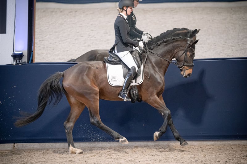Direct from the breeder, we are offering our stunning, completely sensible mare. She is currently in professional training, and her first competition appearance is upcoming. She has been introduced to all the essentials a four-year-old horse should know and is exceptionally gentle. As breeders, we are seeking supportive owners for Daiquira. She undoubtedly has the potential for the grand dressage arena. A fantastic young horse with an excellent pedigree.