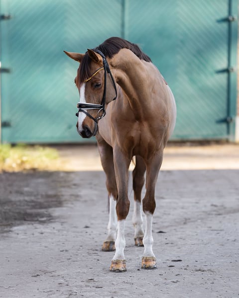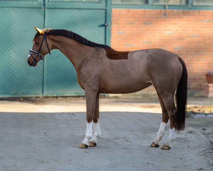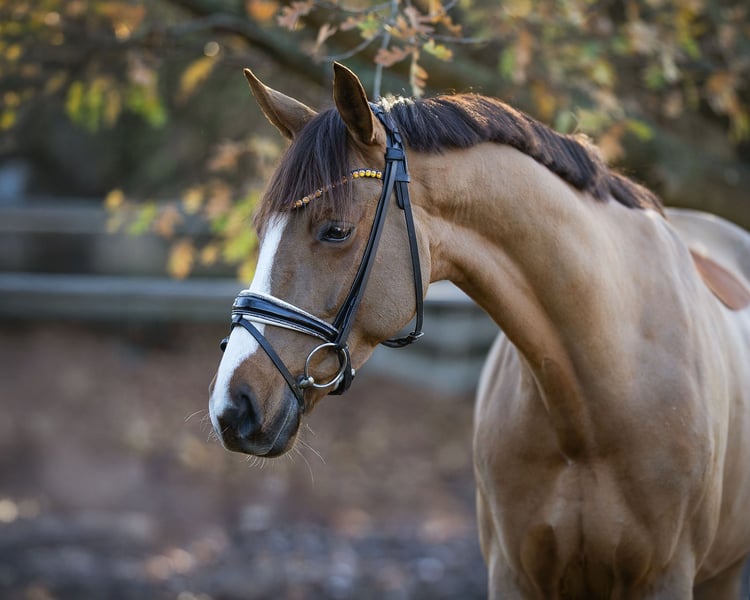 For sale is this exceptionally beautiful and modern chestnut mare, sired by Estobar NRW out of Pik Labionics. Born in 2019, she holds the title of State Premium Mare and has an approximate height of 16.1 hh. Her elegant appearance is particularly highlighted by her refined markings and her four evenly high white stockings – a real eye-catcher in the stable and at competitions. The mare was gently backed at the age of three and successfully completed her mare performance test. She has also been presented in a young horse class for riding horses. In 2023, she gave birth to a well-conformed foal by the stallion “Diamantenglanz.” After weaning, she was brought back into training for sport and subsequently competed in dressage classes at level A. Earlier this year, she was again bred and enjoyed a pasture rest. Unfortunately, she did not become pregnant and is now being ridden regularly again. In character, she is honest, people-oriented, eager to learn, and engaged. She is motivated in daily work and impresses with a very pleasant work attitude. She has a healthy “go,” responds finely to aids, and brings joy to her rider every day. She is a very sensitive mare that still needs guidance and security from her rider, so we are looking for an experienced rider. For less confident or inexperienced riders, she may be a bit too sensitive. In handling, she is an absolute sweetheart – friendly, respectful, and uncomplicated. She is familiar with both stable keeping and 24/7 turnout. In the stable, she can sometimes be a bit restless and likes to root through the straw, so we prefer a management system that allows her plenty of time outdoors and sufficient social contact with her peers. This mare is an interesting option for the competitive rider but is equally suitable for an ambitious leisure rider seeking a finely reined, motivated horse with lots of charm. X-rays are available and can be sent upon serious interest. Please feel free to contact me by phone for any further questions.