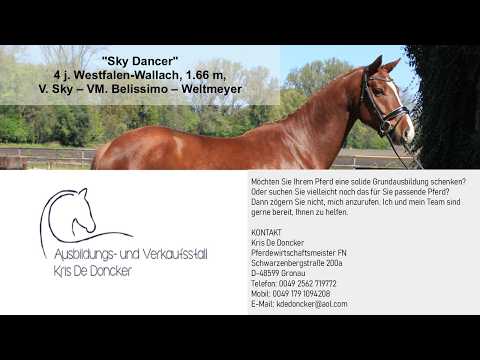Charmanter Fuchs-Wallach mit drei guten Grundgangarten und hohe Rittigkeit. Sky Dancer ist spät angeritten aber ist sehr lernfähig. TÜV ist vorhanden. Mehr Info unter www.dressagehorses-dedoncker.com