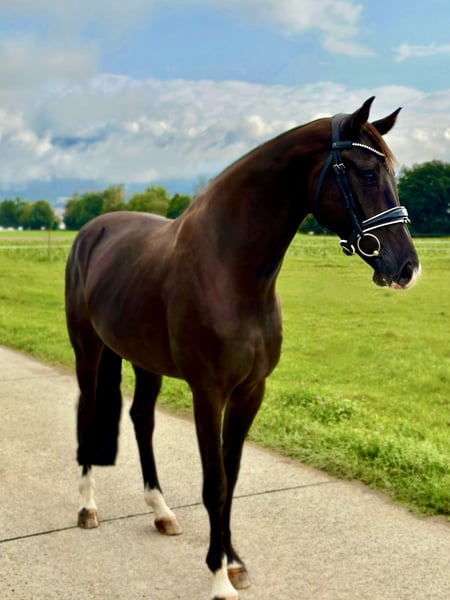 W/R/2022/ Westf./ca.1.67 Galaxy-Ehrenpreis-Laomedon Ein ausgesprochen rittiger Wallach mit traumhafter Optik und schon ganz toller Anlehnung. Dieser bald 4 jhrg. Wallach lässt sich wunderbar arbeiten und hat eine mustergültige Einstellung. Bereits nach kurzer Zeit schon mit dabei auf dem Stoppelfeld-Galopp und auf fremden Plätzen. Im Umgang mehr Labradoodle wie ein Pferd und könnte stundenlang schmusen. Stand bis anhin in der Herde und ist sehr verträglich mit anderen Pferden. Ein Ausbildungspferd par excellence für eine vielversprechende Zukunft. Gelände Video ist vom Früjahr nach 3 Wochen (!!) anreiten. Danach ging er wieder auf Wiese bis Ende Sommer, Dressur-Video ist von Oktober! Im Interesse des Pferdes und zum verhindern des Probereit-Tourismus, kostet ein Probereiten 60.- welche Ihnen beim Kauf vollumfänglich zurückerstattet werden. Ebenfalls haben wir auch immer wieder Pferde, welche aus Diskretionsgründen nicht auf dem Internet erscheinen. Sprechen sie uns sehr gerne auf allen medialen Kanälen an, vielleicht haben wir ihr Traumpferd bereits in unserem Stall stehen.