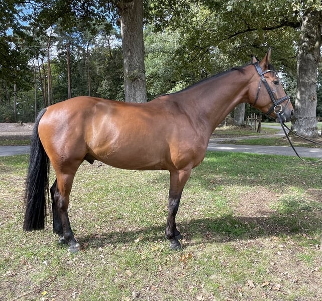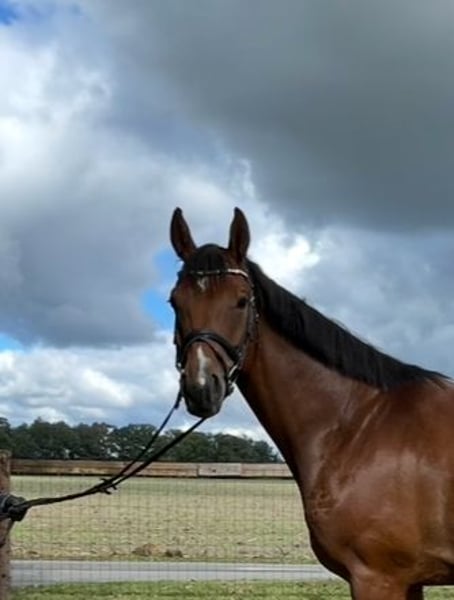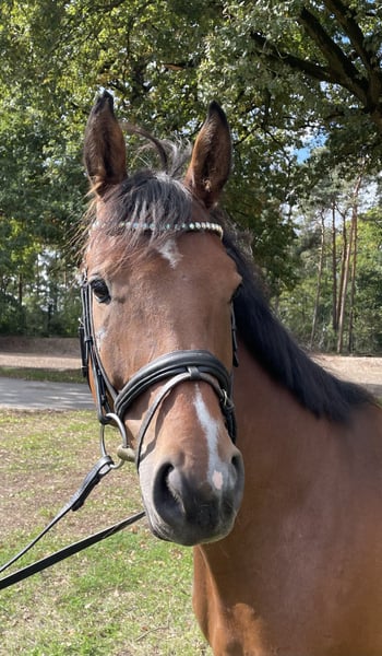 For sale is a 5-year-old brown gelding standing at 166 cm. Cloverleaf completed his first A show jumping competition last week (October 4th) with a solid clear round and a score of 7.4. In the course, he showed himself to be fearless and with a good work ethic; in the warm-up area, he was a bit afraid of oncoming horses but was manageable. At the jump, he demonstrates good scope, carefulness, and a nice bascule. He gives a secure and pleasant feeling and has a good, manageable pull to the jump. He is pleasant to ride in dressage and also behaves well out on the trails; he has successfully mastered his first experiences at the beach and in the mudflats. Due to his size and compact build, we could easily imagine him as a girl’s/lady’s horse. He is familiar with dogs, cats, goats, pigs, lunging systems, tractors, and all the equipment typically found on a farm, and he is herd-compatible. He is used to daily turnout and being stabled at night. Good X-ray images are available; he has a small, irrelevant chip in the left hind fetlock. Because of this and his apparent fear of other horses/traffic, he is being sold below value. A trial ride is possible at any time.