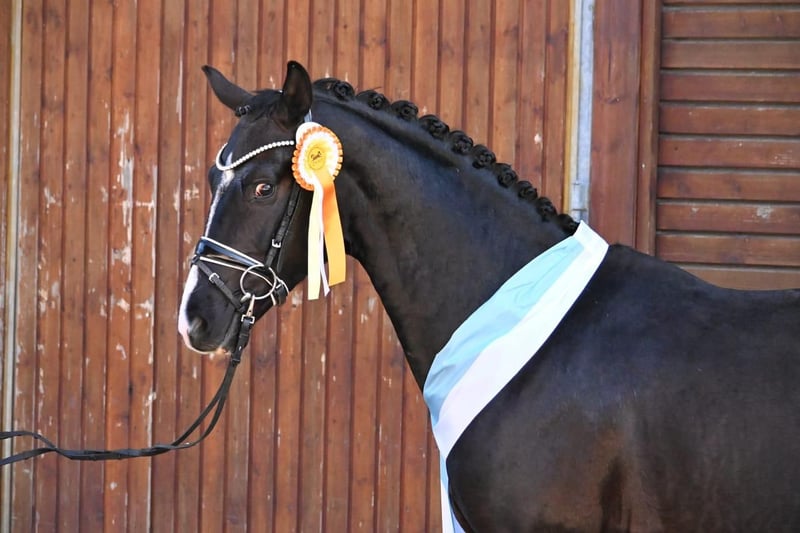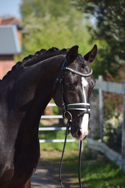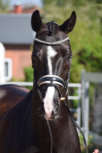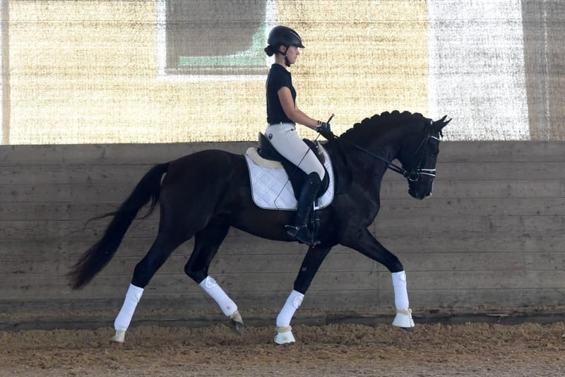 Frascari, Fürst Wilhelm x Sandro Hit, 7-year-old Westphalian gelding, 16.4 hh, was licensed stallion (castrated in December 2024), placed in dressage L, compact build, very personable, affectionate, eager to learn, healthy, front shoes, barefoot behind, easy to handle, not suitable for beginners due to age, good temperament, confident rider needed, requires security from the rider.