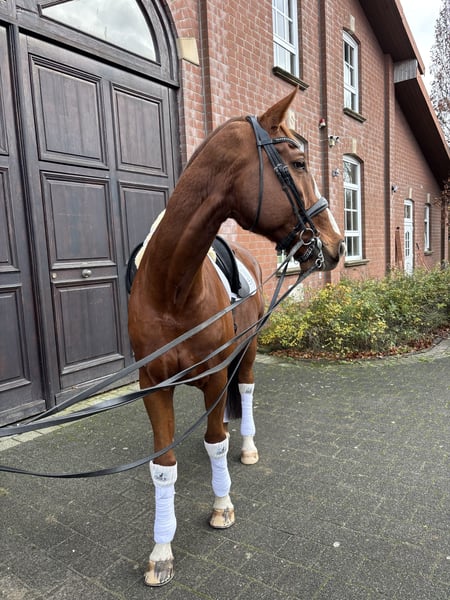 For sale is our 13-year-old chestnut gelding. Don Glorio has competed up to S** level, is always willing to work, and is completely secure in his dressage work. He is absolutely fearless in character and gives his all for his riding partner. In 2024, Don Glorio lost his left eye due to a pasture accident, but that did not prevent him from achieving further success in competitions (still successfully competing after losing his eye). We hope that Don Glorio can become a mentor for a young or ambitious rider and help them progress into the advanced classes. At the same time, it is very important to us that Don Glorio continues to receive lots of love and the attention he deserves. Please feel free to contact us with any questions.