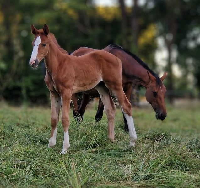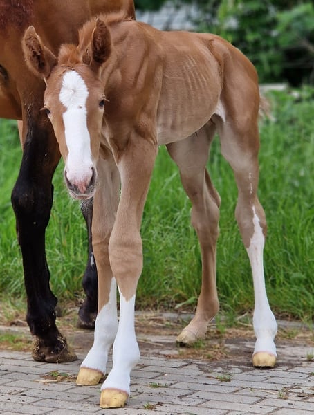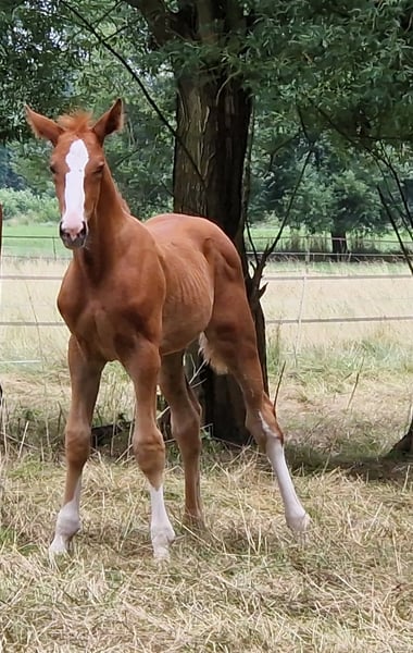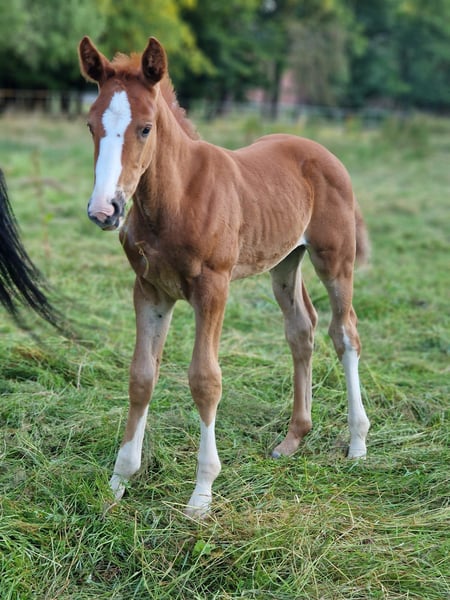 Obladi-Oblada ist ein typvoller bunter Fuchshengst aus dem Jahr 2025 mit einer besonders spannenden springgeprägten Abstammung. Er stammt ab von Ogano Sitte und führt mütterlicherseits das wertvolle Blut von For Pleasure x Don Juan x Wienerwald. Schon heute überzeugt er mit viel Ausdruck, modernem Typ und einer Abstammung, die für Sportlichkeit und Perspektive steht. Als roher Junghengst bietet er seinem künftigen Besitzer alle Möglichkeiten, ihn in Ruhe weiter aufwachsen zu lassen und gezielt für die Zukunft aufzubauen. Wächst im altersgemischten Herdenverband auf. Ein sehr interessanter Nachwuchs für Aufzüchter und Sportreiter, die ein junges Pferd mit attraktivem Pedigree und viel Entwicklungspotential suchen.