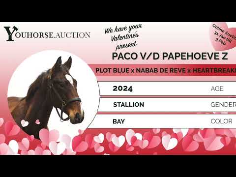 https://youhorse.auction/en/auction/Paco-vd-Paepehoeve-Z-PLOT-BLUE-x-NABAB-DE-REVE Reminiscent of his sire: scope, canter and balance Paco VD Paepehoeve Z strongly reminds us of his sire, the Grand Prix horse Plot Blue. The same type, showing plenty of scope and a very good jumping technique. He has a big canter with a lot of balance and clearly shows blood. He will only turn two years old, yet already convinces with power, technique and a modern way of moving. A young sport prospect with quality and future potential. Sire Plot Blue (Mr. Blue x Pilot) competed internationally at 1.60m Grand Prix level and belongs to the elite of his generation. He produced numerous top international performers and is renowned for passing on scope, canter and competitive mentality. Damline The dam is Nikita de la Vie (Nabab de Rêve), herself competing at 1.20m level, from an exceptionally strong performance family. Nabab de Rêve is a BWP Ambassador and competed internationally at 1.60m level. The second dam Tuut Tuut (Heartbreaker) forms the foundation of a very proven damline. Heartbreaker himself competed internationally at 1.60m level and is one of the most influential showjumping sires of all time. This damline has produced, among others: – Antigone Quality (Berlin), international 1.60m – Wimphof’s Hinde (Berlin), international 1.60m – Condios 13 (Contact van de Heffinck), international 1.50m – Consul de la Vie Z (Clinton), approved stallion, international 1.55m – Cantor de la Vie Z (Clinton), approved stallion, international 1.40m – Diamant de la Vie Z (Diamant de Semilly), international 1.30m – Cassis de la Vie Z (Cumano), international 1.35m Further back, this damline shows a strong concentration of horses competing at 1.30–1.60m level, with influential sires such as Heartbreaker, Clinton, Berlin, Mr. Blue, Nabab de Rêve, Ramiro Z and Calvados. A damline with exceptional depth and proven international performance.