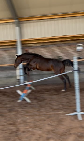 Zum Verkauf steht ein äußerst vielversprechender 2-jähriger Nachwuchskracher mit bester Perspektive für den Sport. Der junge Hengst präsentiert sich in dunkelbrauner Jacke und misst aktuell ca. 1,61 m. Er befindet sich noch voll im Wachstum, das zu erwartende Endmaß liegt bei etwa 1,73 m. Besonders hervorzuheben ist sein harmonischer, korrekt gebauter Körper sowie seine insgesamt sehr ansprechende Erscheinung. Für ein Springpferd fällt neben seinem raumgreifenden Galopp vor allem sein extrem gutes Hinterbein auf, was in einem sehr guten Trab resultiert. Abstammungs- und Leistungspotenzial sprechen klar für ihn: Seine Mutter sowie sein Vollbruder befinden sich ebenfalls in meinem Besitz und können vor Ort besichtigt werden. Der Vollbruder ist bereits erfolgreich im Springsport unterwegs (aktuell auf 1,25 m Niveau) und zeigt deutliches Potenzial für höhere Aufgaben. Sein Vollbruder ist eine absolute Kopie von diesem Hengst. Der Junghengst bringt beste Voraussetzungen für eine erfolgreiche Zukunft im Sport mit und eignet sich für ambitionierte Reiter oder zur weiteren Ausbildung. Absolut kein Notverkauf und geht nur in allerbeste, fördernde Hände. Keine Händler. Das Video zeigt ihn bei seinem allerersten Mal Freispringen und spricht für sich. Bei Interesse oder für weitere Informationen freue ich mich über eine Nachricht.