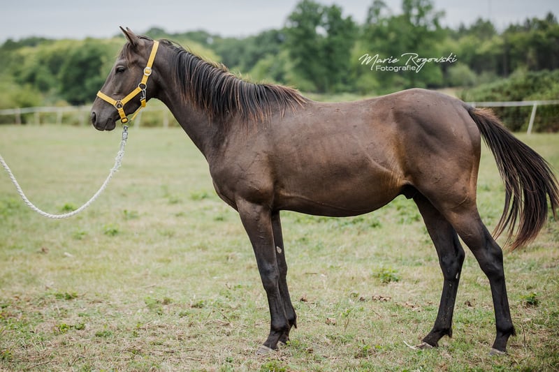 Jeune étalon né tardivement (12.09.2022) issu d'un programme de sélection de couleurs. Fils de l'exceptionnel pur-sang anglais en smoky-cream T C F Palladium xx (True Colours Farm Canada) et d'une tout aussi rare jument demi-sang classic champagne ( !!!) (ZfDP) par Rapptänzer OLD - Khalvin Khlein KpM (Partbred Arabe spécial champagne USA). Née en France avec passeport Zangersheide (main book) et IFCE. Jeune étalon très harmonieux et compact avec un gène crème simple qu'il peut transmettre. Polyvalent et utilisable. Sa taille finale sera de 162-164 cm à l'âge de six ans. C'est maintenant le plus jeune garçon du groupe, qui profite de sa jeunesse à l'extérieur dans l'élevage pour grands gaillards, sans perdre le contact quotidien avec l'homme et qui s'en occupe avec autant de curiosité que de détermination au haras. L'alimentation, le pansage, le soin des sabots nus, la conduite, le parcours au sol et le chargement (transport par camion) lui sont familiers, tout comme les vermifuges et les vaccins. Last Smoke est confié à des mains attentives et peut rester une année de plus pour un élevage adapté aux besoins (avec un étalon), tout en poursuivant sa formation.