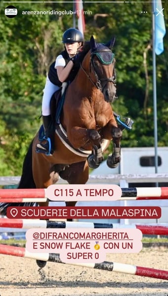 VENDO per cambio cavallo la nostra bellissima SNOW-FLAKE VD LAARSEHEIDE Z, femmina del 2010, altezza al garrese 163cm. Ha gareggiato in Olanda fino alla categoria 135cm ed utilizzata da noi in Italia per gare fino a 115cm per prendere il primo grado. È una cavalla bravissima e super vincente; 13 podi in 17 gare con il livello 115cm. Assolutamente ideale per chi passa dal pony al cavallo, avendo una galoppata facile. Ottimo carattere senza alcun vizio. Attualmente al maneggio di Arenzano (Ge), per la visione e qualsiasi prova. Contattate il n° (+39) 339-4369912 per informazioni e video. Alberto.