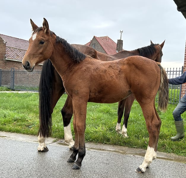 Sterk merrieveulen van ContagioZ. Contagio Z geeft paarden met een goed karakter en heel goede rijdbaarheid. Verschillende van zijn nakomelingen springen 1m60. oa Coby 8, Contagious, Best boy 2, Cipetto 2, Cessna 24 ,... De eerste nakomeling van de moeder Cleo is een gekeurde hengst nu 7jaar oud. Springt nu 1m35 parcours. De moeder ,Cleo, is zelf 1m75 en geeft steeds grote maat mee. Veulen is goed in de hand. Videos mogelijk via whatsapp +32477810986
