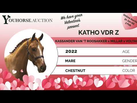 https://youhorse.auction/en/auction/Katho-VDR-Z-KASSANDER-VAN-T-ROOSAKKER-x-MILLAR Very attractive chestnut with power, engine and quality Katho VDR Z is a very attractive chestnut with a strong presence and clear quality. He is quick off the ground, jumps well away from the fence and shows plenty of power. His good hind-end technique stands out; he is careful and jumps with good overview. Strongly built, with a powerful hindquarter and an engine that is always on. A young sport horse that convinces with technique, strength and expression. Sire Kassander van ’t Roosakker (Echo van ’t Spieveld x Electra van ’t Roosakker) competed internationally at 1.40m level and is licensed with Zangersheide and AES. He originates from the world-famous Roosakker damline, known for producing international showjumpers and approved stallions. Kassander is recognized for passing on reflexes, technique and attitude. Damline The dam is Catho (Millar), herself competing at 1.50m level, from a very strong performance family. Millar competed internationally at 1.60m level and is known for transmitting scope and attitude. The second dam Oltaira (Voltaire) produced several international sport horses, including: – Catho (Millar), international 1.50m – Eye Catcher II (Winsconsin van the Cruyenvelden), international 1.45m – Venise (Indoctro), 1.35m The third dam Rina also produced international performers, including: – Symphonie (Heartbreaker), international 1.60m – Jolliness (Lys de Darmen), international 1.40m – Ombretta (Laredo), international 1.40m – Casiopeia (Centauer Z), international 1.40m – Quinto (Quite Easy I), international 1.45m A damline with exceptional depth and proven international sport from 1.30m up to 1.60m level.