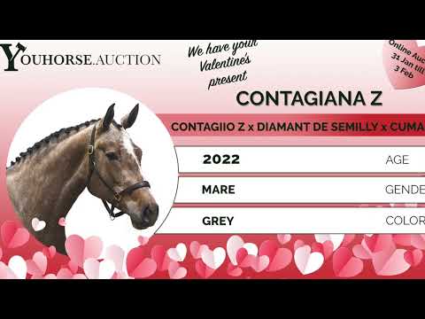 https://youhorse.auction/en/auction/Contagiana-z-CONTAGO-x-DIAMANT-DE-SEMILLY A beautiful type with quality and versatile potential Contagiana Z is a beautiful grey with a very attractive type, well built and clearly uphill in her frame. She makes a good jump and shows a correct, smooth jumping technique. Besides being a quality showjumping prospect, she could also be suitable as a hunter in the future. A pleasant horse to work with, easy to move and straightforward in her way of going. An appealing model with quality and presence. Sire Contagio (Colman x Carthago Z) competed at the highest level, performing internationally up to 1.65m Grand Prix. He is licensed with Holstein, Oldenburg and Hanoverian and is known for passing on technique, carefulness and attitude. Contagio has produced several international sport horses, including Best Boy 2 (1.65m), Contagious (1.65m) and Catch Me Marathon (1.60m). Damline The dam is Diana Z (Diamant de Semilly), descending from a very strong performance family. Diamant de Semilly himself competed at 1.60m Grand Prix level and is one of the most influential showjumping sires worldwide. This damline has produced several international showjumpers: – Argo Z (Asca Z), international 1.50m – Comiana Z (Comilfo Plus Z), international 1.40m – Porsche (Kasanova de la Pomme), international 1.45m – Agino Z (Aganix du Seigneur), approved Zangersheide stallion, international 1.35m The second dam Celin Z (Cumano) also produced multiple sport horses, including Cargo Z (1.30m) and All In One Z (1.40m). Further back in the damline we find Fibra and Akima van Meerdaalhof, confirming consistent production of sport horses from 1.30m up to 1.55m level, with reliable quality and technique.
