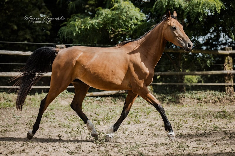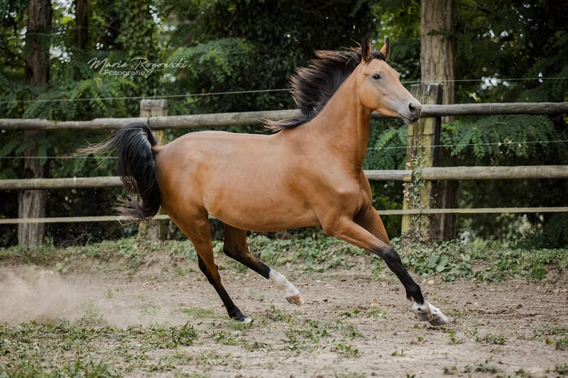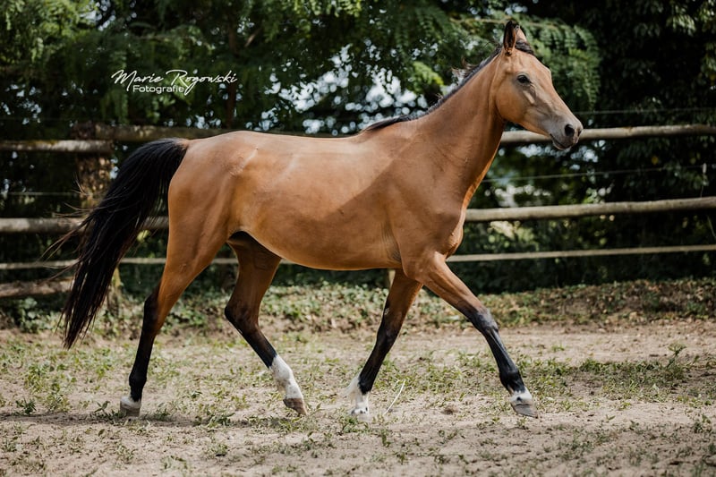 Mare | Zangersheide | Buckskin | born 2020 | currently 157 cm BUTTERFLY Z is a striking, athletically built mare in a rare buckskin colour with excellent movement potential. Her springy, rhythmic gaits suggest a future in competitive equestrian sports – whether eventing, dressage or show jumping. Sire Bezant comes from performance-tested international lines with a focus on show jumping and eventing. Dam Melisande GF is herself athletically inclined, impresses with very good movement and has already proven herself as a reliable broodmare. Butterfly Z combines athletic talent with a special colour and interesting pedigree – ideal for riders with prospects or for further breeding.