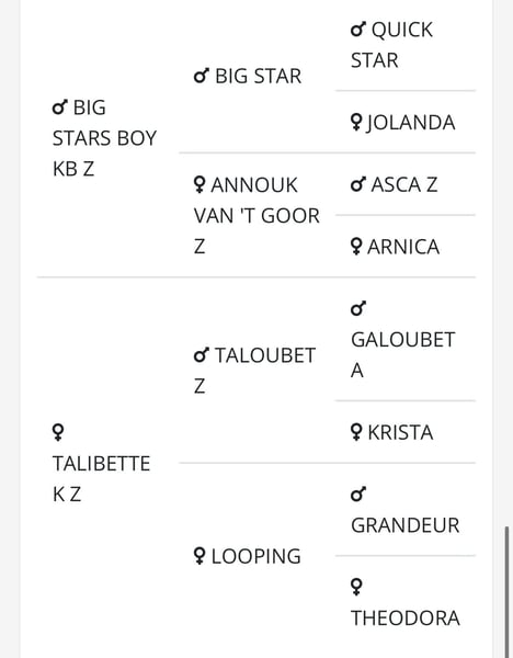 Jeune cheval prometteur Jument Zangersheide de 4 ans, sosa de Big Stars Boy (Big Star x Asca Z) x Taloubet Z x Grandeur Environ 1,70 m Excellent jeune cheval avec beaucoup de potentiel. Actuellement en cours de dressage. Bonnes radiographies disponibles.