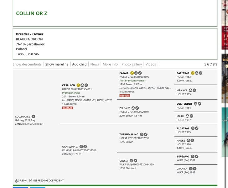 I offer for sale a four-year-old gelding, Collin OR Z, with a Zangersheide passport, coming from an outstanding show jumping line. Directly from the breeder. Collin OR Z is a son of the stallion Casallco (Casall x Contender), who himself successfully competed in competitions up to 160 cm and passes on strength, technique, and a sporting character to his offspring. On the dam's side – Gratelina G by Turbud Alino – a reliable, proven female line that provides health, endurance, and a stable temperament. Collin OR Z is a healthy horse, never ill, regularly trimmed and vaccinated. Raised in a pasture, in a peer group – toughened and in excellent condition. Very calm and stable in character, he copes well with new situations. The horse is untrained, directly from the breeder, ready for further training. He has already been lunged and desensitized to various stimuli (umbrellas, toys), making him trusting and easy to handle. This is a great opportunity for those looking for a young sport horse with high jumping potential, excellent pedigree, and a balanced character. Father: Casallco (Casall x Contender) – an award-winning Holsteiner stallion, successfully competing in competitions up to 160 cm. A descendant of the legendary Casall Ask – winner of many 5* Grand Prix and a key horse for the German team at the World and European Championships. Casallco is known for his modern type, excellent jumping technique, and outstanding character, and his offspring achieve success in international sport. Mother: Gratelina G – daughter of the stallion Turbud Alino (Alcatraz x Nanke), who was a recognized horse in breeding and sport, valued for his jumping predispositions and passing on good temperament and health to his offspring. The female line comes from proven Wielkopolski horses (Bergamo, Gnom), which produce durable, harmoniously built, and versatile horses. For sale, I offer a beautiful gelding of Zangersheide breed, born in 2021. The horse has a bay coat and stands at 168 cm. This is a young, promising horse, ideal for show jumping. He has excellent predispositions for work in sport, and his balanced character makes him suitable for both experienced riders and those who are just starting their equestrian journey. The horse is healthy, regularly vaccinated, and well cared for. I encourage you to contact me for more information and to arrange a viewing. Don't miss the opportunity to become the owner of this exceptional horse!