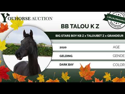 El potro de cinco años BB Talou K Z realiza todo con gran facilidad y tiene un galope notablemente bueno. El semental Big Stars Boy KB Z, su padre, tiene ocho años, es aprobado por Zangersheide y es hijo del campeón olímpico Big Star, y proviene de la media hermana de los caballos de Gran Premio a 1,60 m, Aristo Z y Sea Coast Pebbles Z. La yegua Talibette K Z, su madre, desciende de Taloubet Z, ganador de la Final de la Copa del Mundo. Ya hay dos descendientes compitiendo a nivel internacional: John Star K (nivel 1,35 m) y Bigtalougran K Z (nivel 1,40 m). La abuela, Looping (Grannus), compitió a nivel 1,35 m. https://youhorse.auction/en/auction/BB-Talou-K-Z-BIG-STAR-BOY-KB-Z-x-TALOUBET-Z