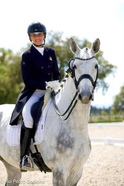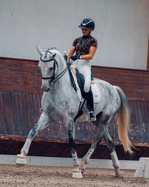 Nous vous présentons GIACONE VAN HET LINDENHOF, élégant hongre Zangersheide gris, 8 ans et toisant 1m76. Un cheval de grand cadre, moderne, avec de la présence et une vraie distinction sous la selle. Son modèle harmonieux et puissant s’associe à trois allures de qualité, dont un trot ample et expressif qui capte immédiatement le regard. Giacone n’est pas seulement un beau cheval : c’est un cheval formé, construit, avec une base solide et une progression cohérente. Coté origines : Père : GALLIANI BIOLLEY Étalon reconnu pour transmettre locomotion, puissance et aptitude au rassembler, produisant des chevaux avec du cadre et une vraie capacité sportive. Mère : Rosetta Van Het Lindenhof Père de mère : Rascalino Une génétique orientée dressage moderne, combinant amplitude, énergie et capacité naturelle au travail rassemblé. Giacone a été formé avec méthode et progressivité. Champion des 4 ans en Cycle Libre à Saumur Circuit des 7 ans à plus de 70 % Vice-champion du Portugal en niveau Pro 3 Aujourd’hui, il évolue au niveau PSG – Inter I, avec : Changements de pied au temps acquis Début de piaffe Début de passage Il possède les bases techniques nécessaires pour continuer à évoluer vers le haut niveau amateur, voire professionnel selon le projet. C’est un cheval prêt à performer. Giacone est un cheval très agréable à monter. Il se distingue par : Trois allures généreuses et cadencées Un trot avec beaucoup d’amplitude Une bonne énergie naturelle De la disponibilité dans le travail Il cherche toujours à bien faire, reste attentif à son cavalier et conserve une vraie stabilité mentale. Très gentil, respectueux et attachant, il conviendra parfaitement : À un amateur ambitieux souhaitant apprendre avec un cheval d’école À un cavalier souhaitant accéder sereinement au niveau PSG / Inter À un professionnel recherchant un cheval prêt à entrer en piste Son tempérament permet d’envisager une progression pédagogique et structurée. À pied comme monté, Giacone est : Respectueux Facile Sans vice Stable dans son comportement Un cheval sérieux, fiable, qui travaille dans la bonne énergie et reste agréable à gérer. En résumé: Giacone Van Het Lindenhof est un cheval de dressage formé, expérimenté et prêt à performer, avec cadre, locomotion et base technique solide. Un partenaire d’évolution pour un cavalier souhaitant conjuguer performance, pédagogie et fiabilité.