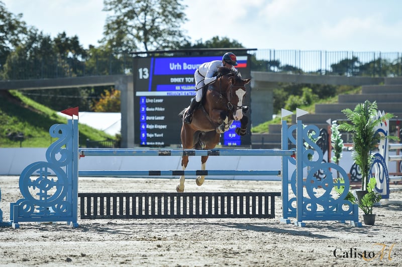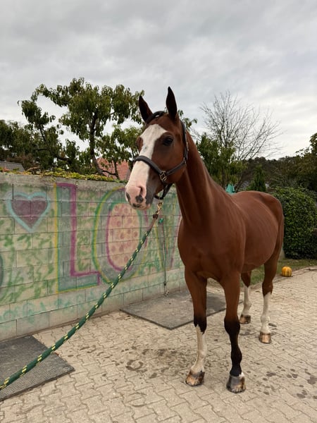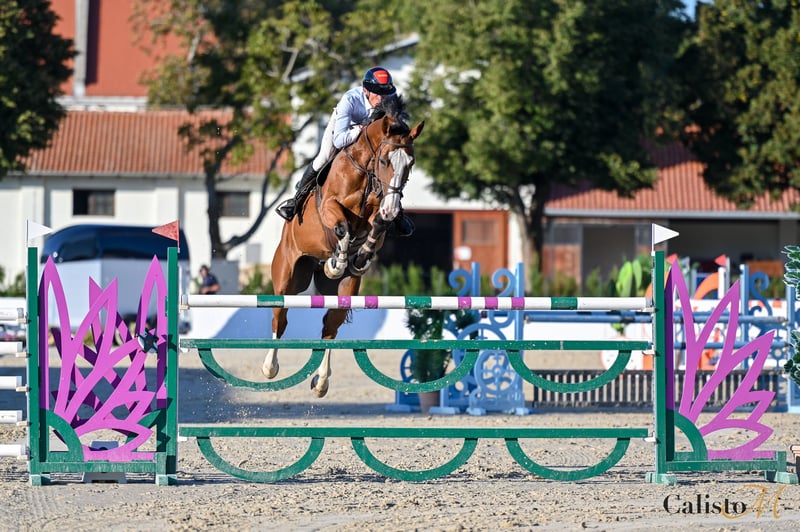 Dinky is a kind 9 year old gelding. He so far jumped up to 130cm and CSI 2* shows, 145cm at home. He has lots of scope and potential. He is strong- so not suitable for begginers. He loads and travels nice. Stands in cross ties, for the farrier. Well behaved on trail rides.
