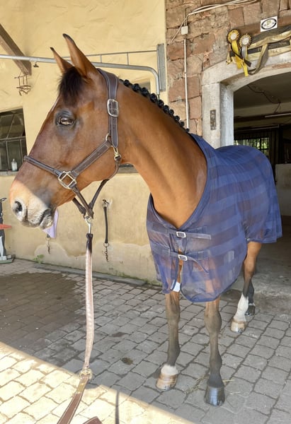 Schweren Herzens verkaufen wir hier unseren 2012 geborenen ca 166 großen Wallach. Wesley haben wir vor 9 Jahren (5 jährig) direkt vom Züchter gekauft. Er ist bis S Springen platziert und hat zahlreiche Siege und Platzierungen in L und M Springen. Im Parcours ist er ein richtiger Professor, der seinen Job kennt. Auch in der täglichen Arbeit macht Wesley jeden Tag Freude, ist super schön zu reiten und geht natürlich auch brav ins Gelände (in der Gruppe und alleine). Er ist Allergiker und bekommt bei uns bedampftes Heu/ Heulage und steht komplett draußen bzw. nachts in einer Paddockbox. Ich werde ihm aufgrund meines Studiums zeitlich nicht mehr gerecht, weshalb wir jetzt die Entscheidung getroffen haben ihn, wenn alles zu 100% passt, abzugeben. Wir verkaufen ihn nicht für den größeren Sport sondern wünschen uns ein Zuhause entweder als Einsteigerpferd/ Lehrmeister oder als gehobenes Freizeitpferd mit Endplatz. Bei ernsthaftem Interesse und weiteren Fragen gerne PN